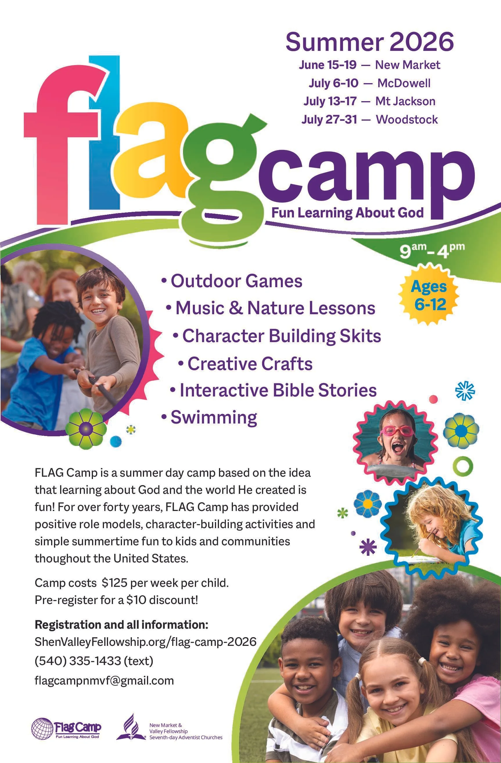 Cost: Unless otherwise noted, the registration fee for FLAG Camp is $125/child/week or $25/child/day. There is also a $10/week discount for pre-registration (here online for certain locations only). Registration fees are due (cash or check only) at the first drop-off starting at 8:30am. Checks can be made payable to the New Market Seventh-day Adventist Church. Registration fees cover the cost of pool entrance fees, a t-shirt (please indicate the child’s shirt size on the registration form), a musical instrument, and all other camp activities.